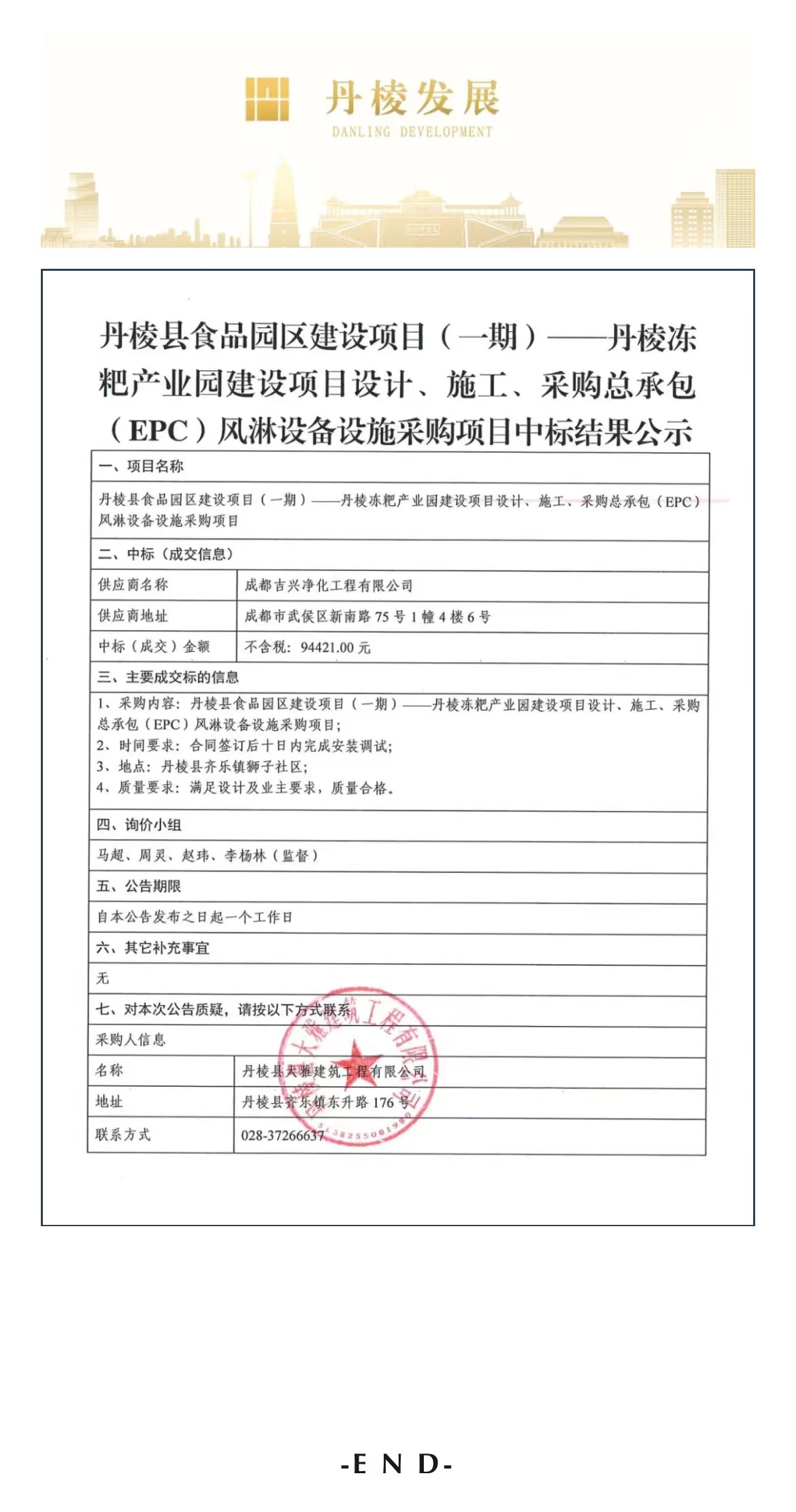 丹棱縣食品園區(qū)建設項目(一期)—丹棱凍粑產(chǎn)業(yè)園建設項目設計、施工、采購總承包(EPC)風淋設備設施詢價采購項目中標結果公示