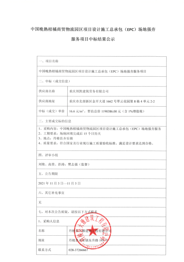 【大雅建筑公司】中國晚熟柑橘商貿(mào)物流園區(qū)項(xiàng)目設(shè)計施工總承包(EPC)場地強(qiáng)夯服務(wù)項(xiàng)目中標(biāo)結(jié)果公示