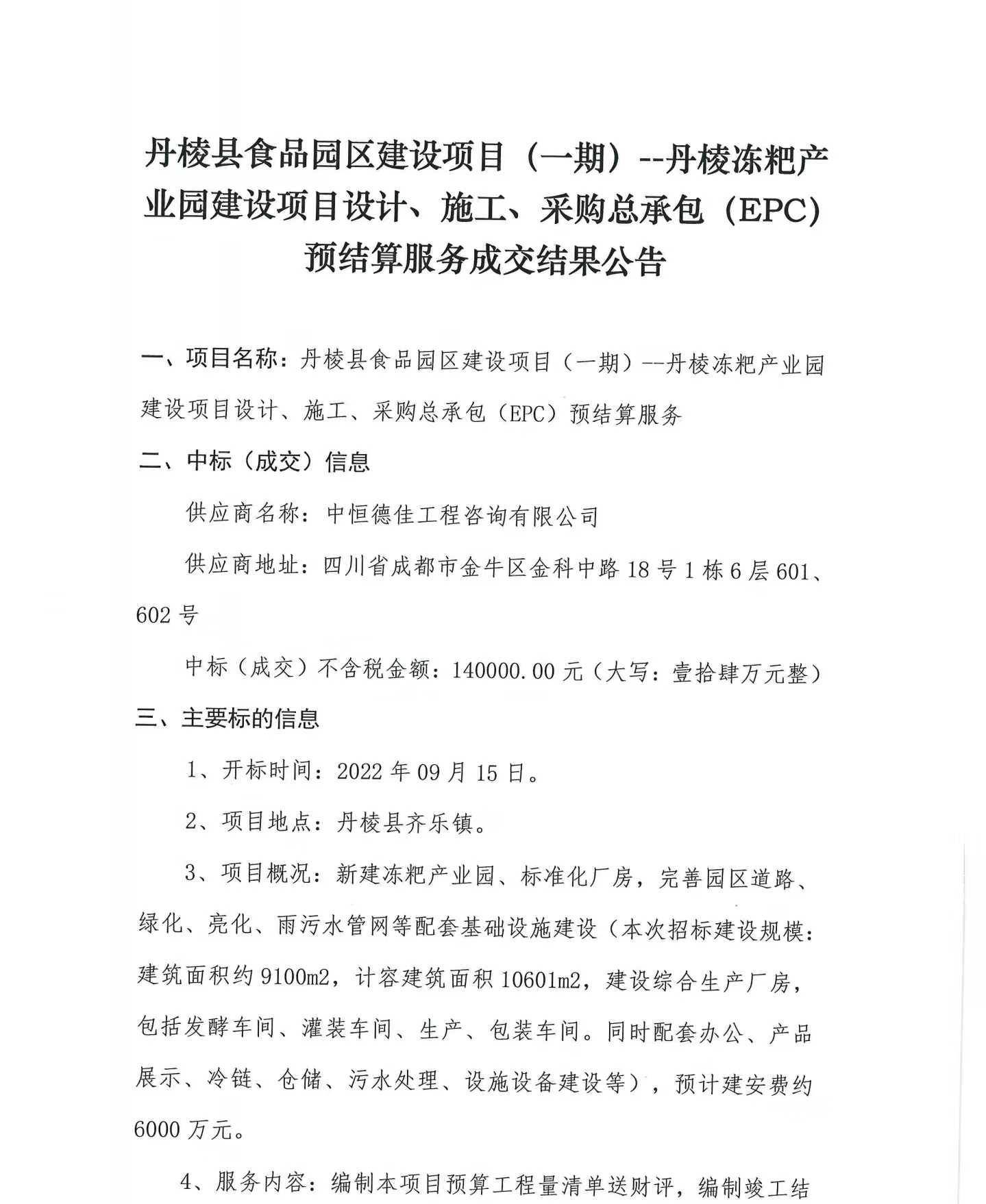 丹棱縣食品園區(qū)建設(shè)項(xiàng)目(一期)--丹棱凍粑產(chǎn)業(yè)園建設(shè)項(xiàng)目設(shè)計、施工、采購總承包(EPC)預(yù)結(jié)算服務(wù)成交結(jié)果公告
