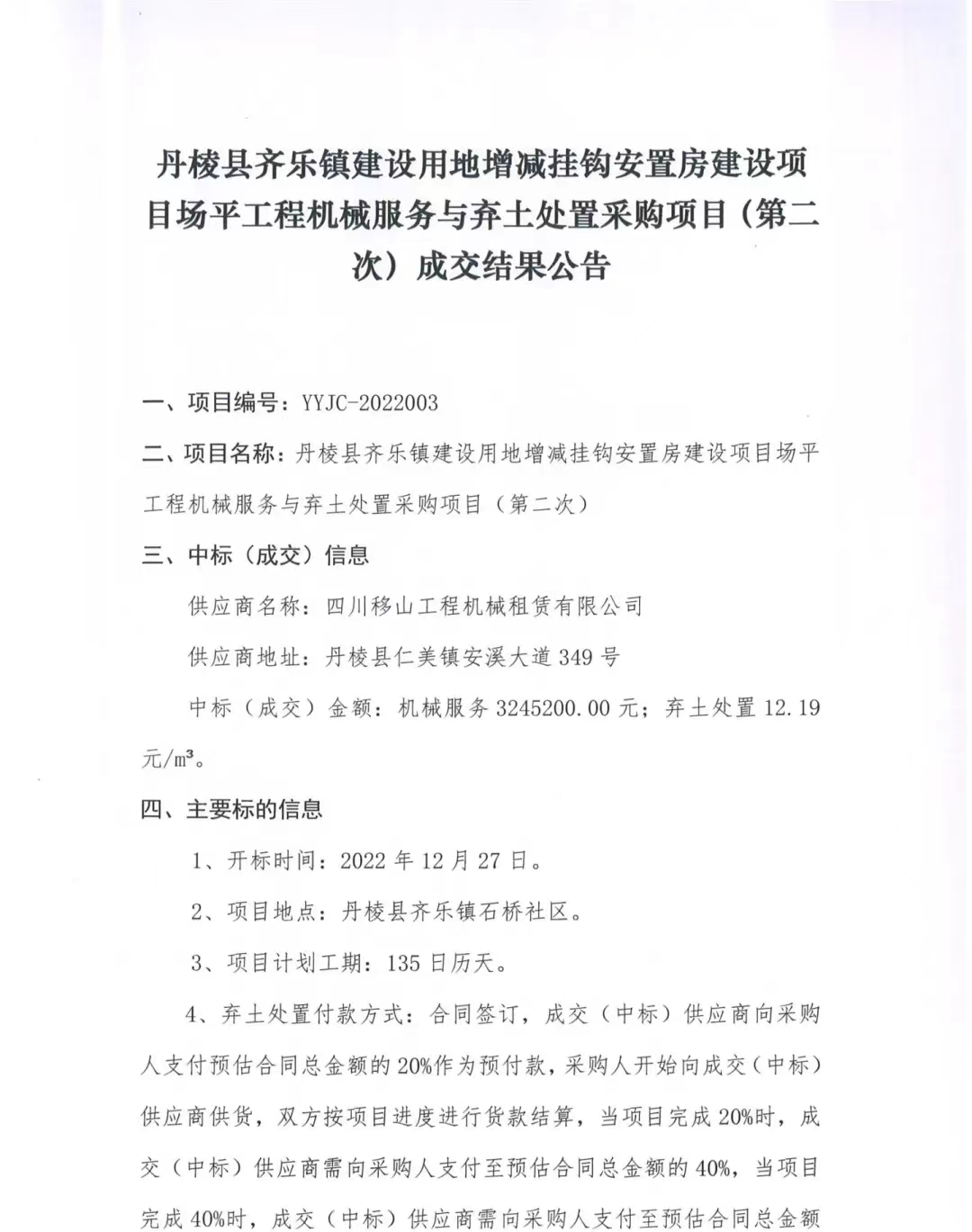 丹棱縣齊樂鎮(zhèn)建設(shè)用地增減掛鉤安置房建設(shè)項目場平工程機(jī)械服務(wù)與棄土處置采購項目(第二次)成交結(jié)果公告