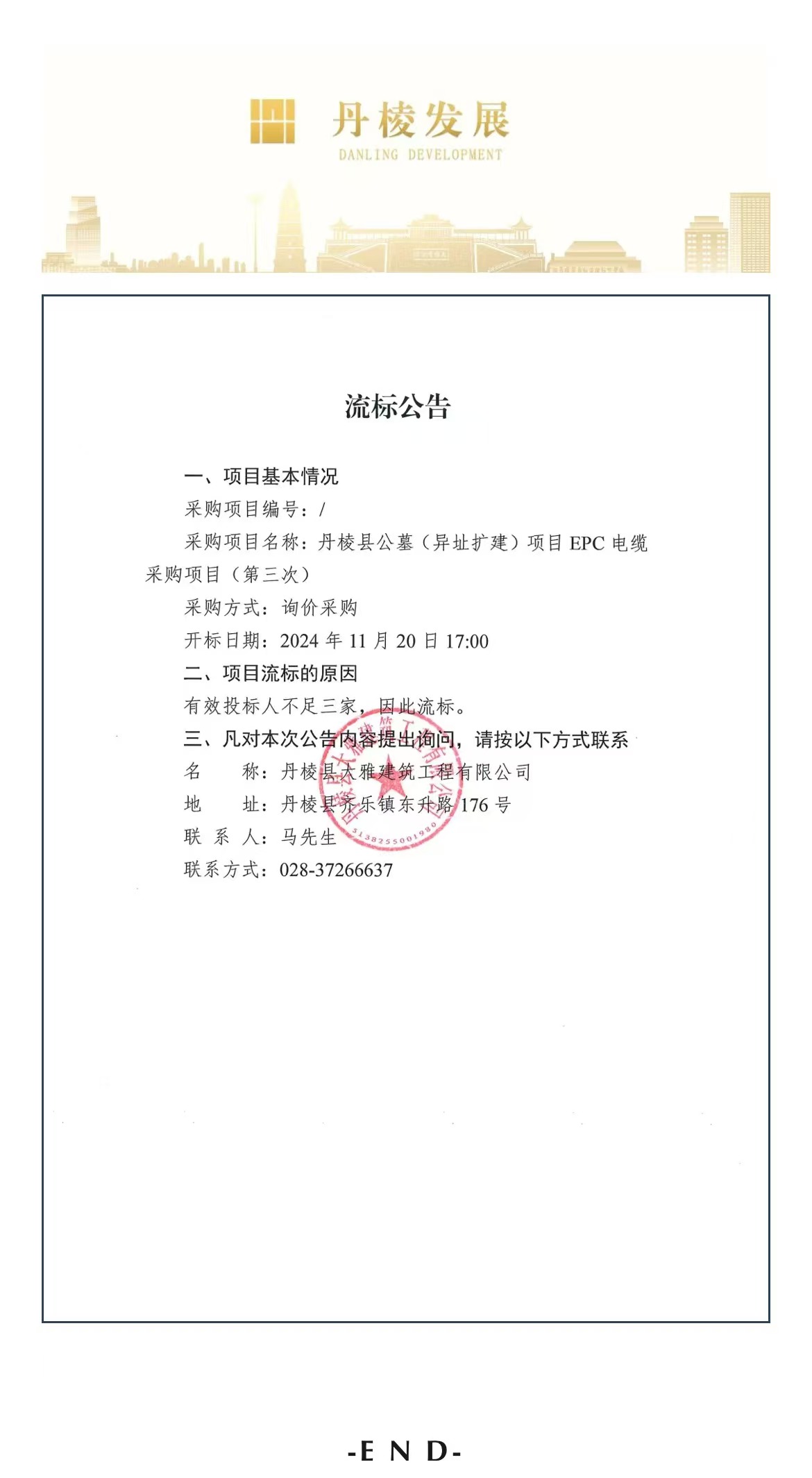 丹棱縣公墓(異址擴(kuò)建)項(xiàng)目EPC電纜采購(gòu)項(xiàng)目(第三次)流標(biāo)公告