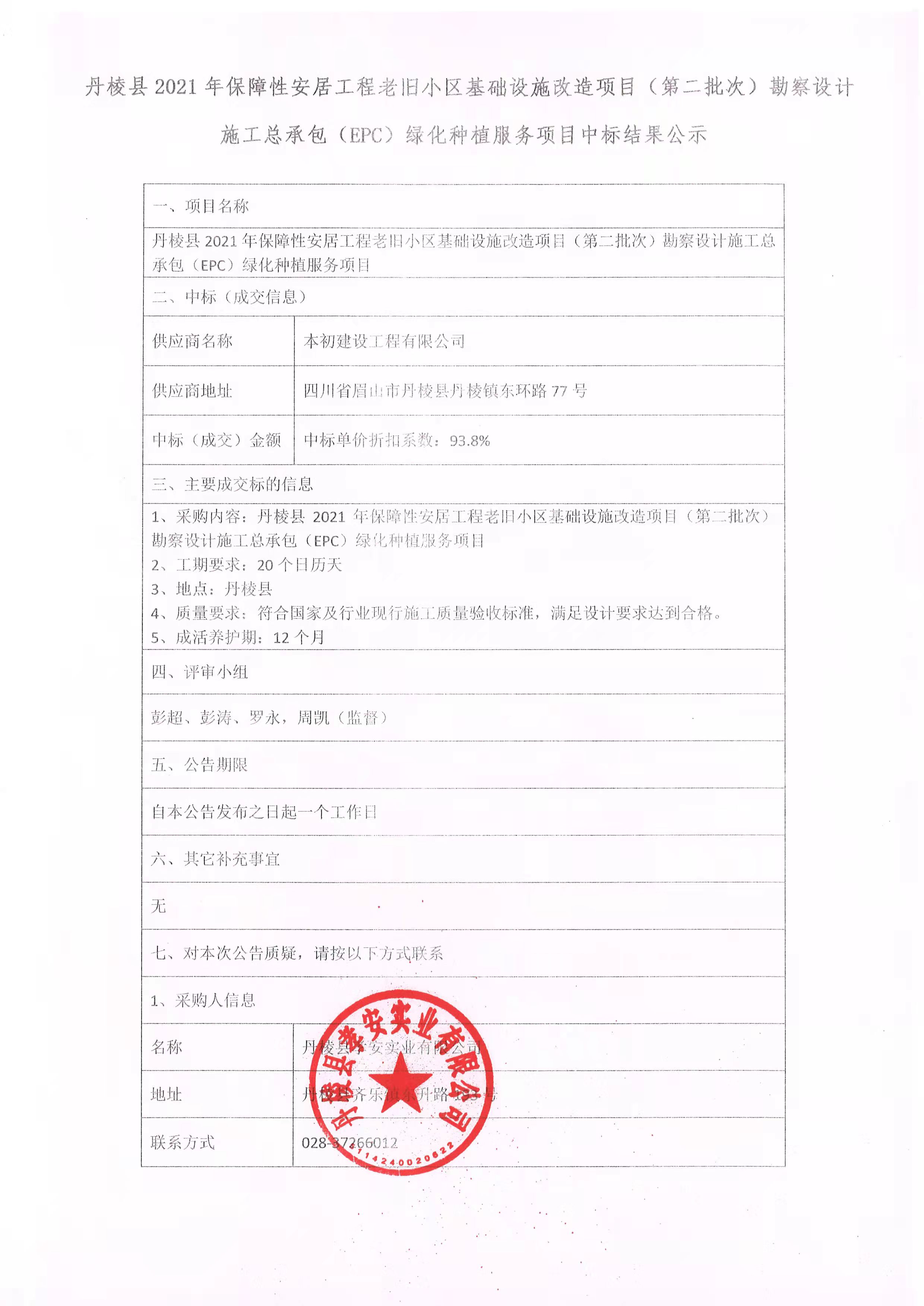 【縣孝安公司】丹棱縣2021年保障性安居工程老舊小區(qū)基礎(chǔ)設(shè)施改造項目(第二批次)勘察設(shè)計施工總承包(EPC)綠化種植服務(wù)項目中標結(jié)果公示