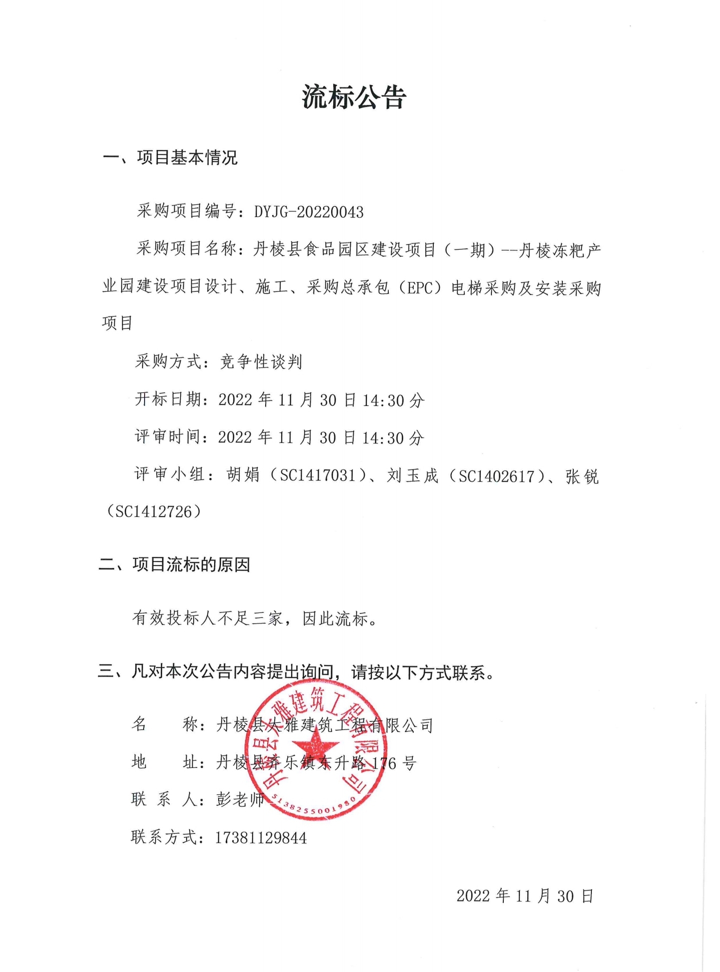 丹棱縣食品園區(qū)建設(shè)項(xiàng)目 (一期)--丹棱凍粑產(chǎn)業(yè)園建設(shè)項(xiàng)目設(shè)計(jì)、施工、采購(gòu)總承包 (EPC) 電梯采購(gòu)及安裝采購(gòu)項(xiàng)目流標(biāo)公告