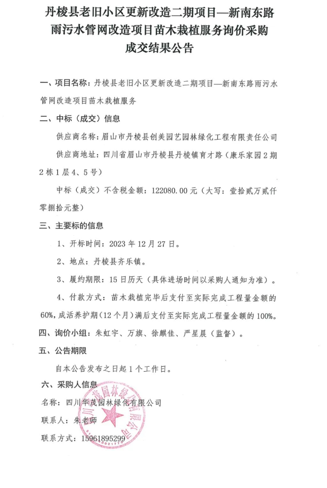 丹棱縣老舊小區(qū)更新改造二期項(xiàng)目——新南東路雨污水管網(wǎng)改造項(xiàng)目苗木栽植服務(wù)詢價(jià)采購成交結(jié)果公告