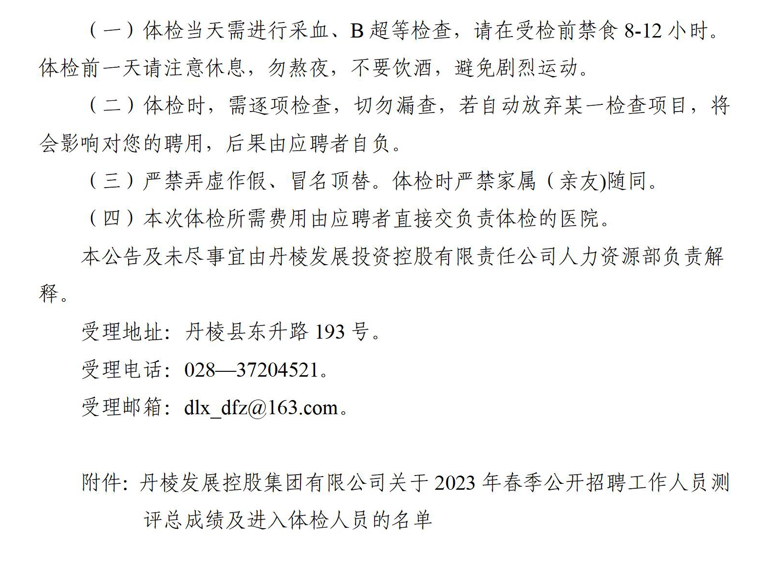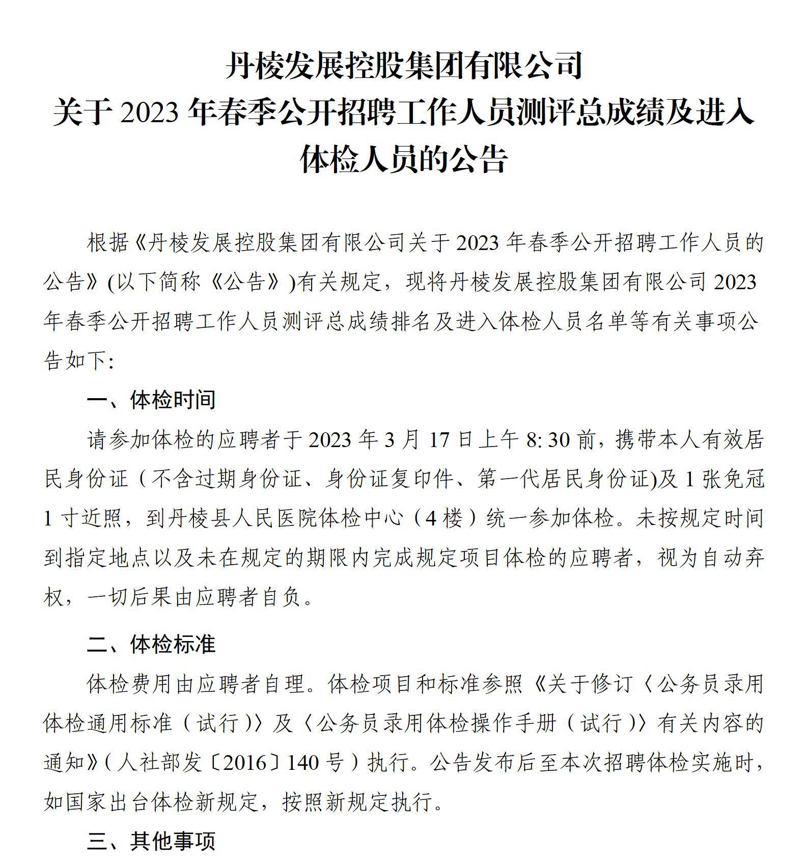 丹棱發(fā)展控股集團(tuán)有限公司關(guān)于2023年春季公開招聘工作人員測評總成績及進(jìn)入體檢人員的公告