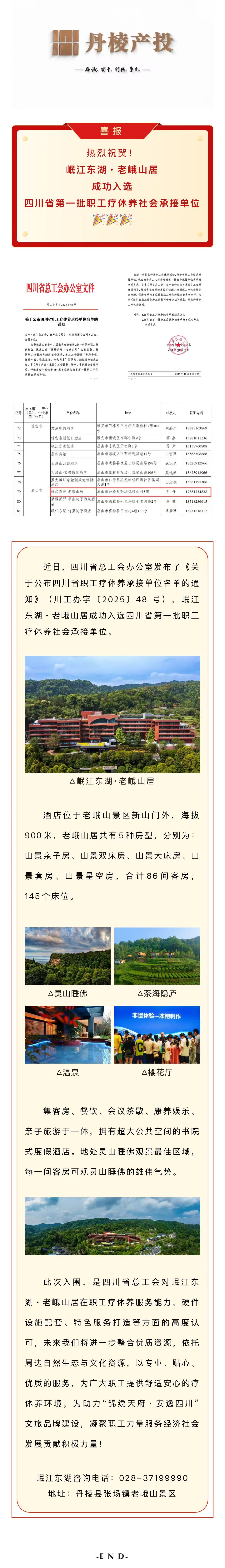 【縣文旅公司】喜報(bào)!岷江東湖・老峨山居入選四川省第一批職工療休養(yǎng)社會承接單位名單!