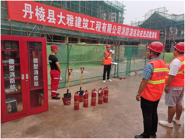 為進一步提高丹棱縣大雅建筑工程有限公司(以下簡稱“縣大雅建筑公司”)全體工作人員消防安全意識和應急處置能力,6月24日,我司在仁美鎮(zhèn)雙橋社區(qū)農(nóng)副產(chǎn)品交易中心項目(以下簡稱“雙橋項目”)施工現(xiàn)場組織開展了一場消防應急演練,此次演練邀請到丹棱發(fā)展投資控股有限責任公司相關領導和部室人員觀摩指導。